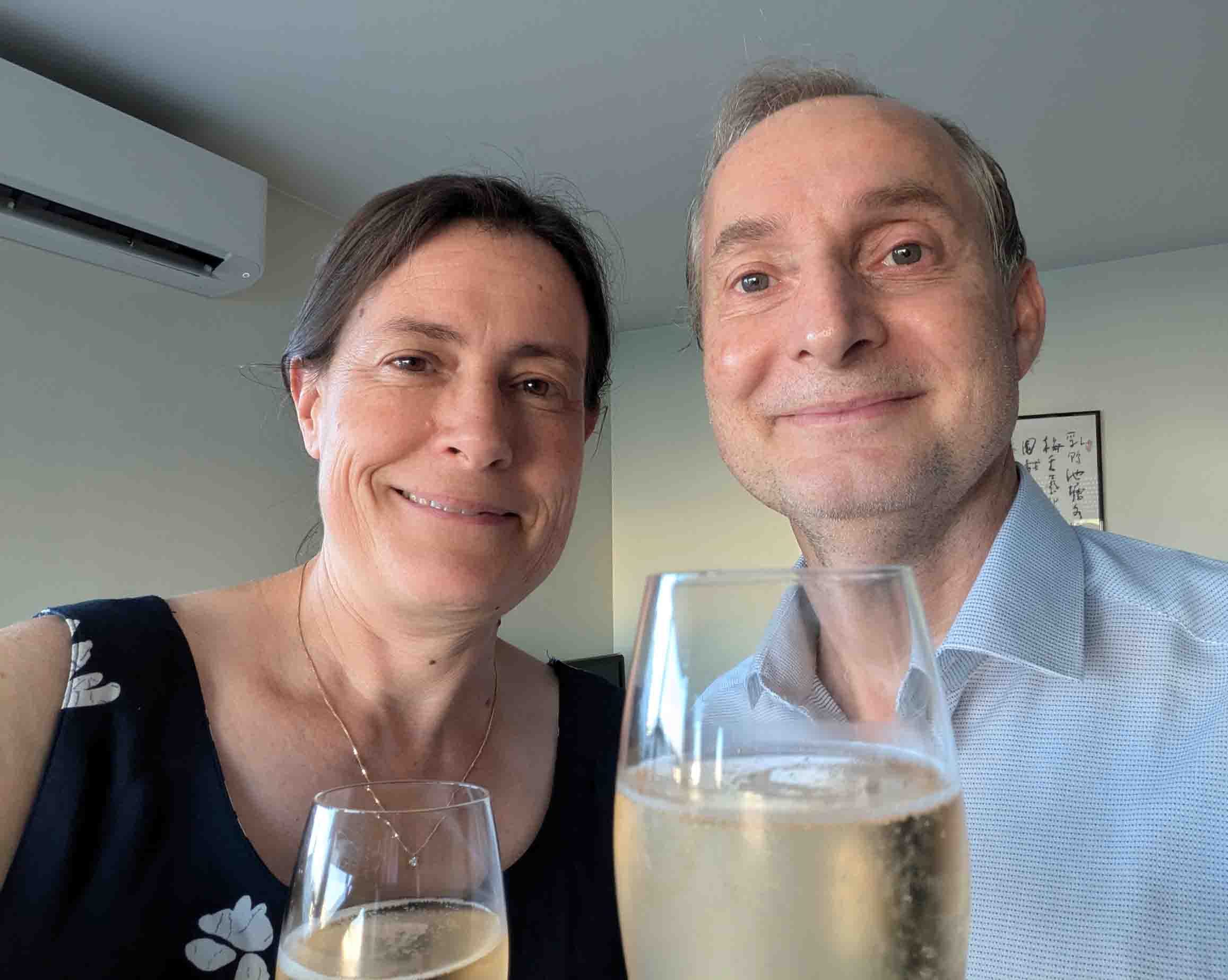 Anyway, back to France. Christian did install a single air conditioning unit in the living room of our apartment two years ago. He’s in his late 50s, and this is the first time in his life that he’s had air conditioning at home. It’s a mini split, one that could also be used for heating should we ever need it. We don’t use it much, even in August. I don’t have a picture of it, but you can see it behind us in this photo we took on our fourth wedding anniversary.